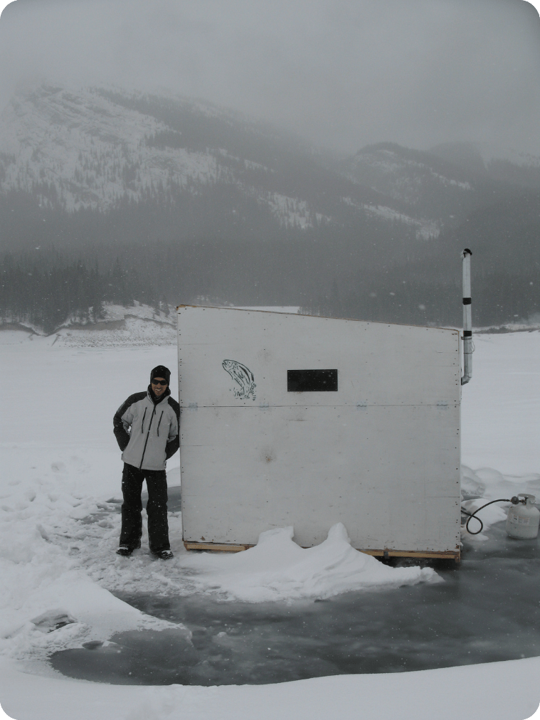 This is us trying our hand at it in Kananaskis Country, just west of Calgary. There were no toilets anywhere close (what they say about yellow snow is absolutely true), it was extremely cold (but hot chocolate was on hand), AND between three of us, we managed to catch one fish!